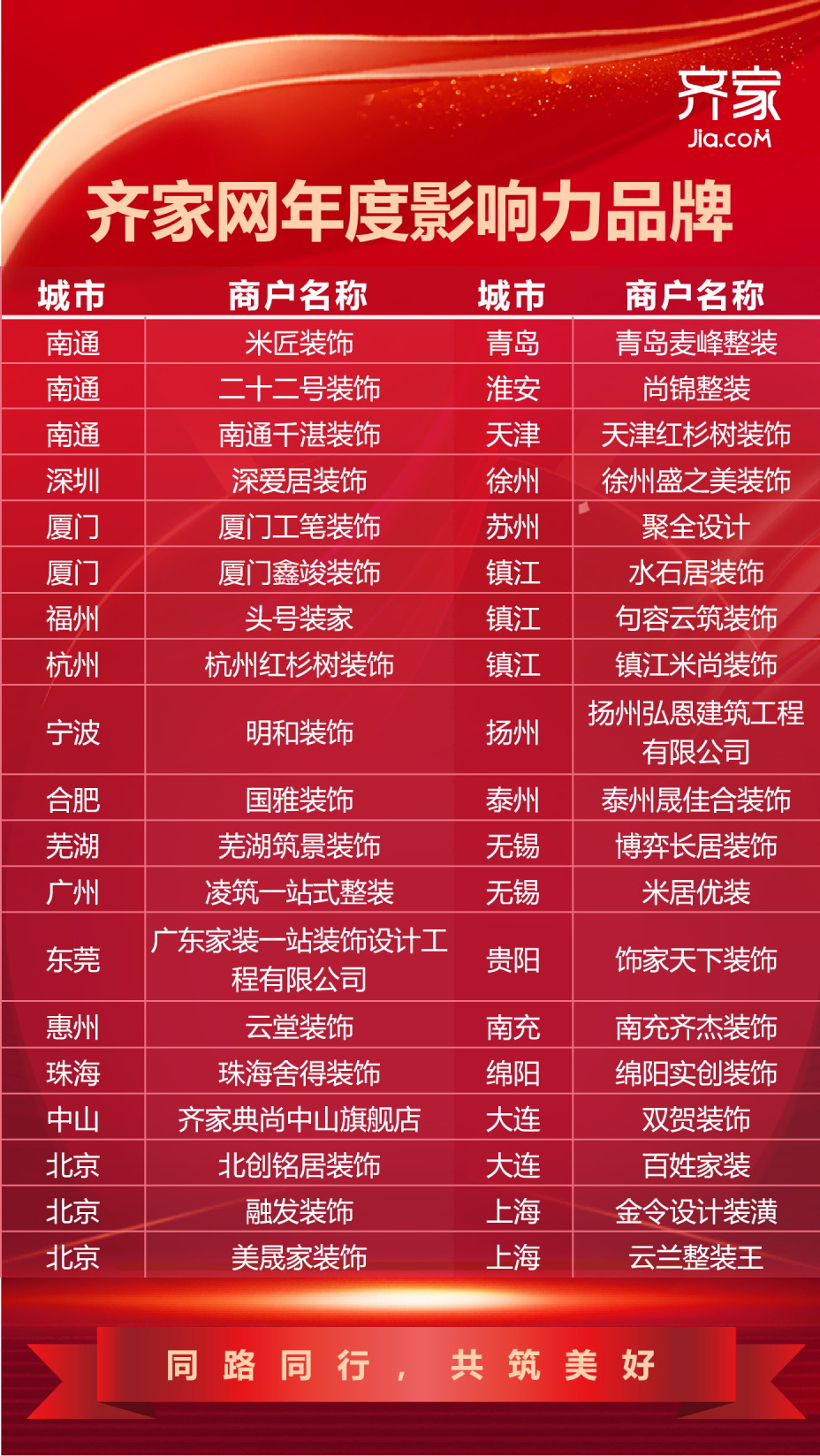 感谢你们以长期主义精神,夯实齐家平台的信任基石!影响力不止于规模,更在于责任与担当。期待更多重视品牌声誉、珍视用户口碑的优秀装企加入齐家,共塑家装行业的品质未来。