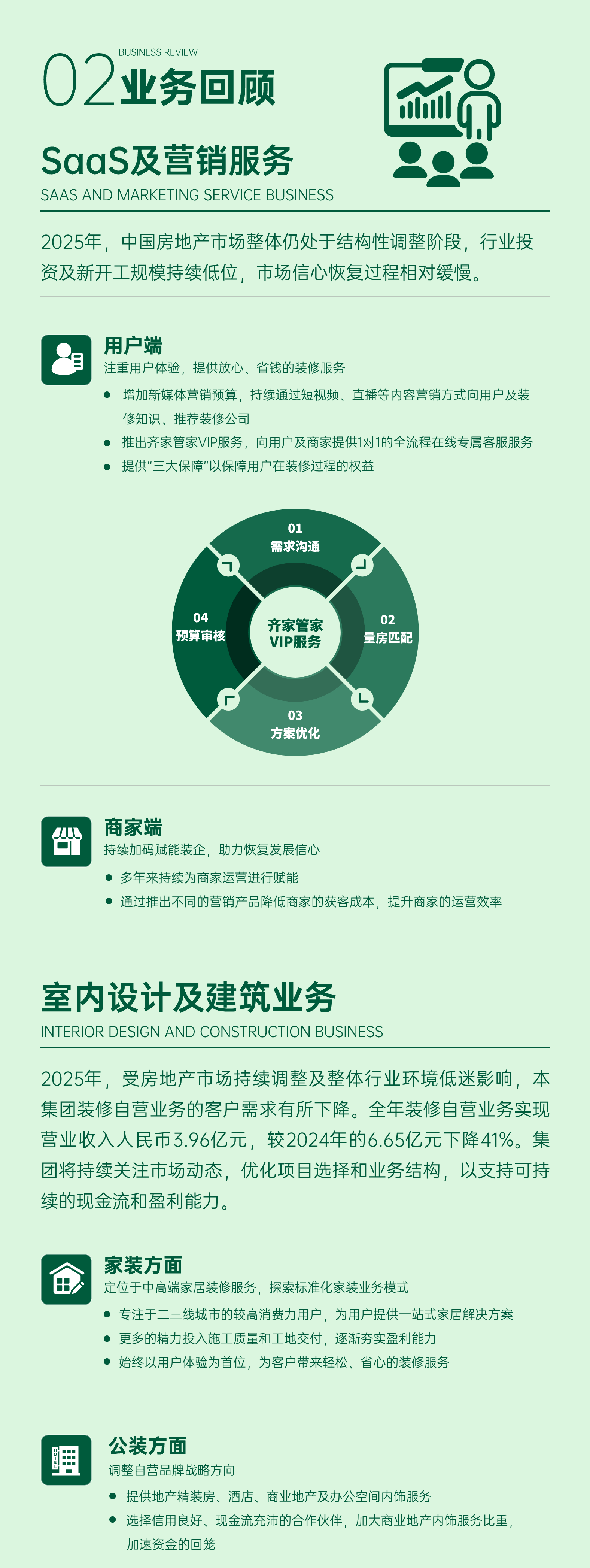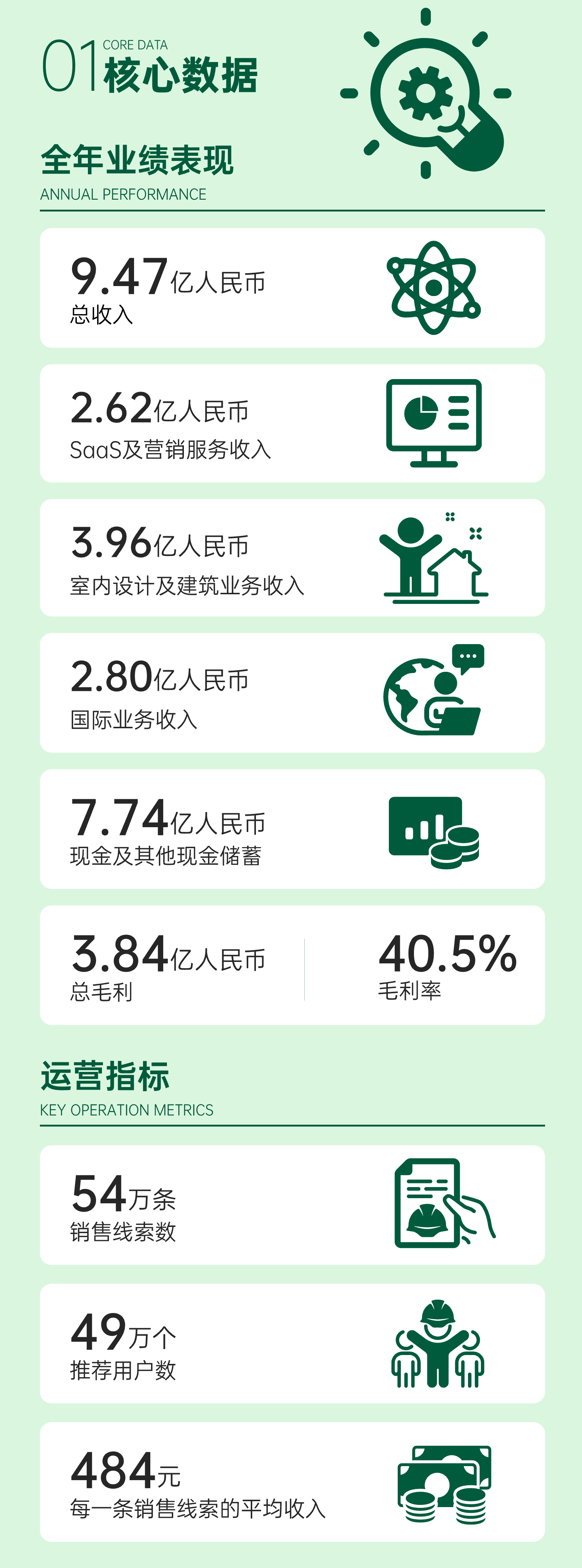 3月31日,齐家网(齐屹科技01739.hk)公布了2025年全年业绩,其中总收入为9.47亿元人民币(单位下同),saas及营销服务收入为2.62亿元,室内设计及建筑业务收入3.96亿元,总毛利为3.84亿元。